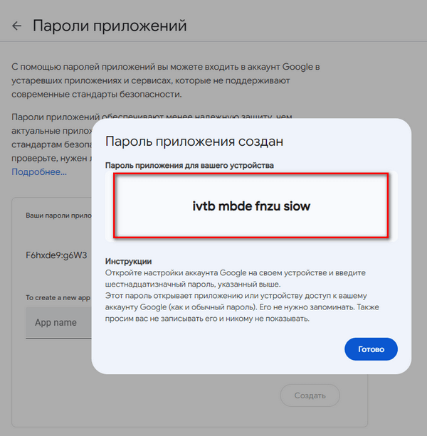 12) В строке "App name" придумываем и вводим пароль и нажимаем кнопку "Создать". Сохраняем созданный пароль, он потребуется для отправки сообщений с сайта.