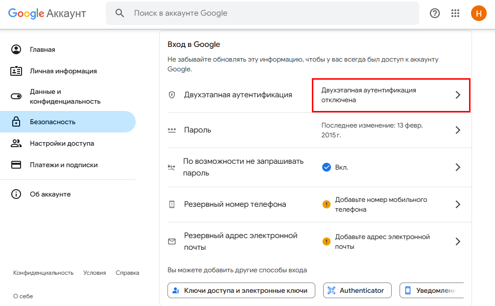 4) Нажмите на "Двухэтапнная аутентификация отключена".