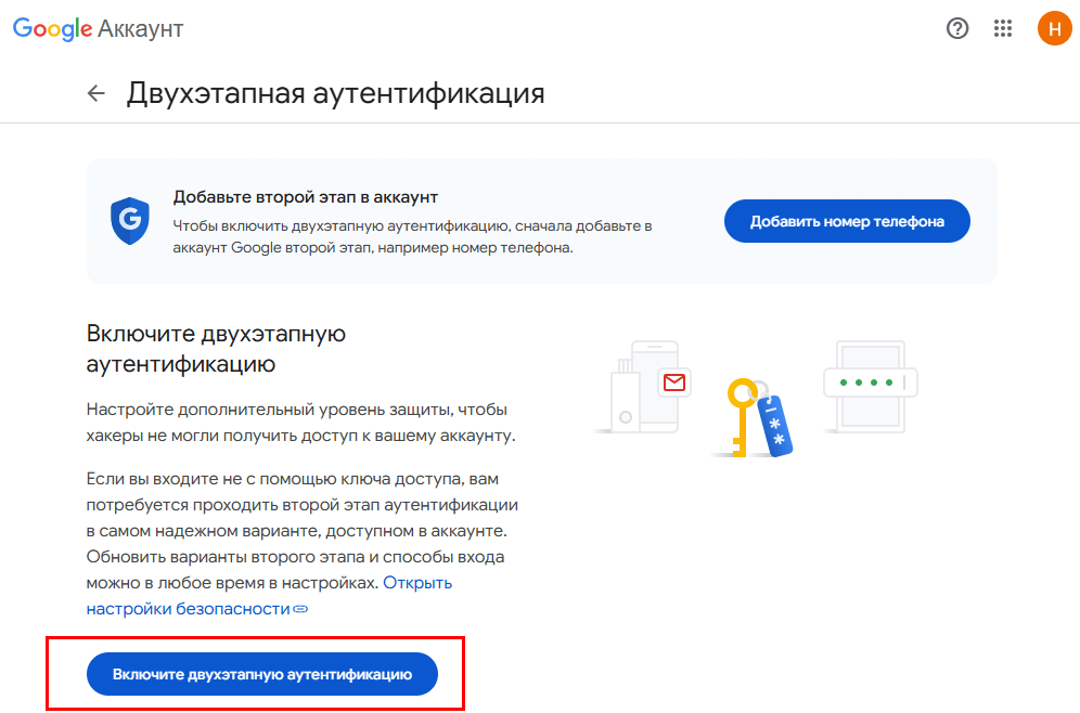 5) На следующем экране описывается двухэтапная аутентификация. Нажмите "Включите двухэтапную аутентификацию".