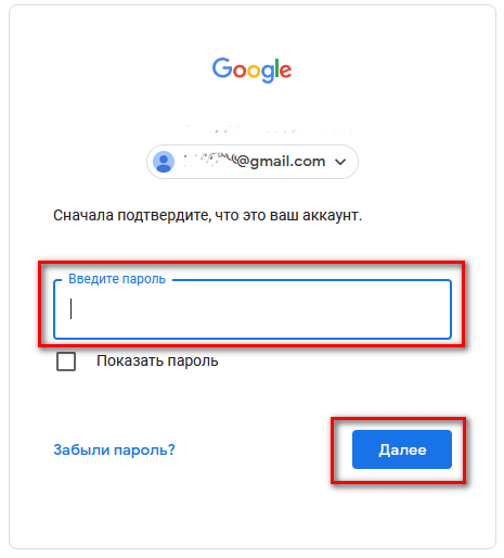 6) Введите свой пароль от электронного ящика и нажмите Далее.