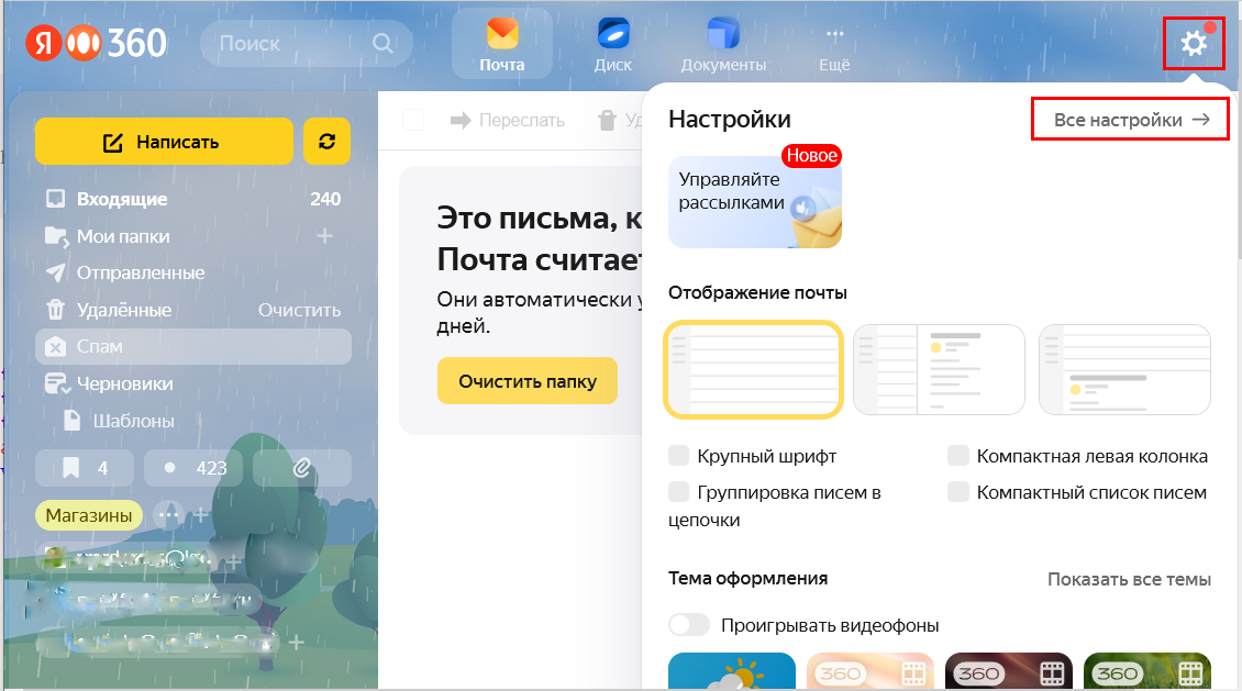 1) Войдите в свой почтовый ящик. Вверху, справа нажмите на шестеренку, в открывшемся меню нажмите на "Все настройки".