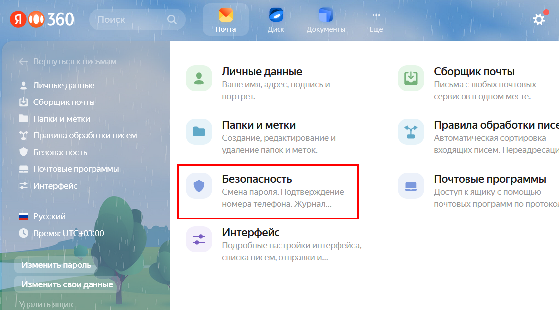 2) Выберите "Безопасность" в левом блоке или в блоке по центру