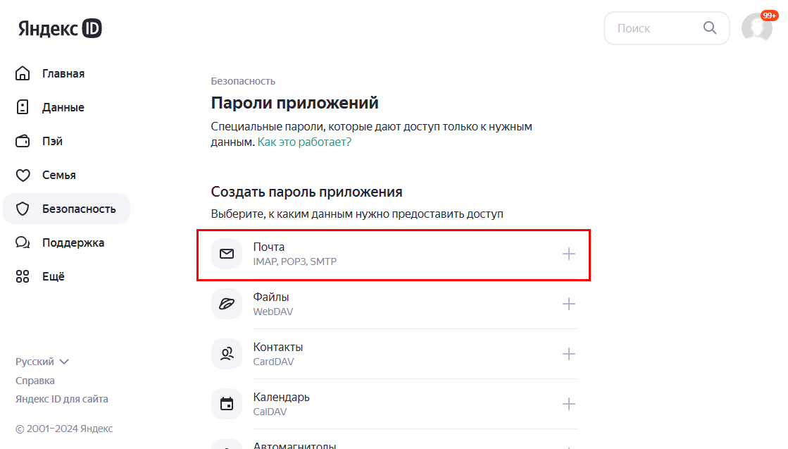 4) В блоке "Создать пароль приложения" выберите первый пункт "Почта".