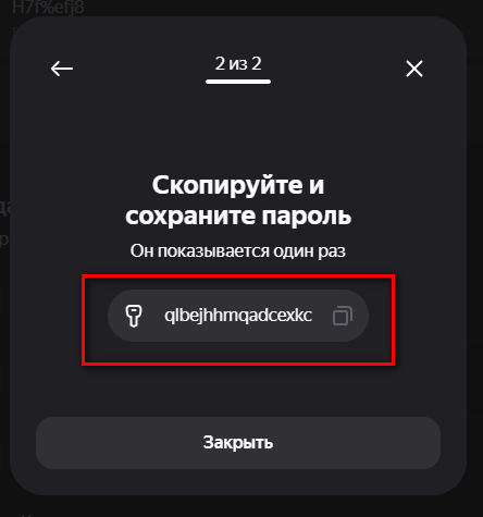 6) Сохраните полученный пароль. Он панадобиться для приема писем с сайта.